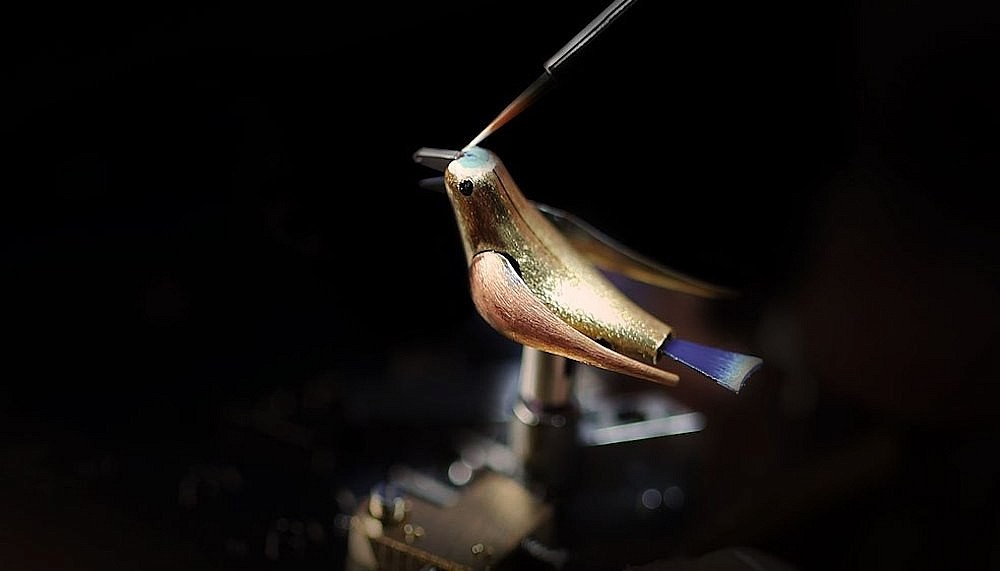 The company refers to these exceptional creations as the “art of astonishment,” and indeed these pieces take an incredible amount of detail and hours to create and are often years in development before coming to market. The Charming Bird timepieces, first introduced by Jaquet Droz in 2013, are the first-ever wristwatches to feature a singing bird. The mechanical creation is typically seen only in museum or collector’s pieces, like 18th-century gilded snuff boxes and ornate toy pistols that would spit out a bird when triggered.