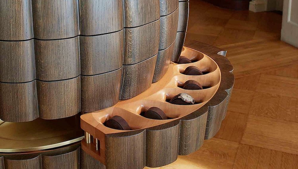 Made out of oak and pear wood, its 22 suede-detailed drawers has room for 108 watches. The intricate inner mechanisms are made out of bronze, and was inspired by and meant to complement the timepieces it safeguards.