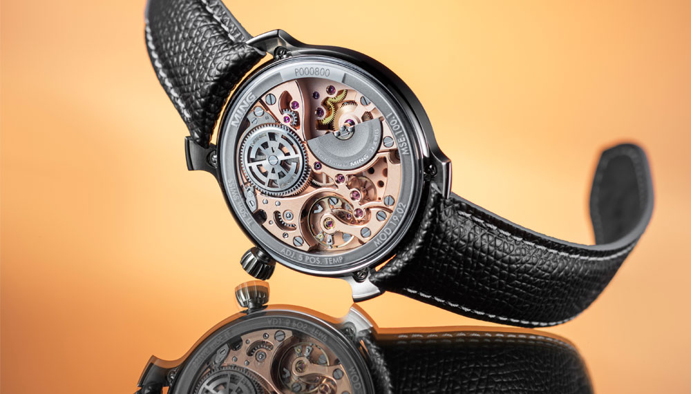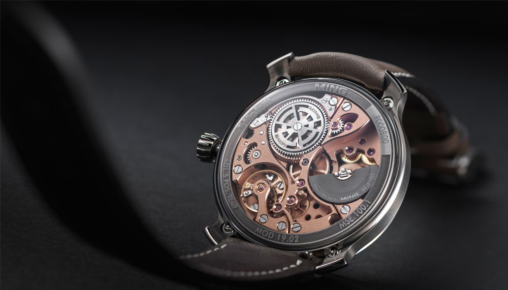The watch it evolves from is the 19.01, which was the first of MING’s flagship series and shortlisted for a 2018 GPHG award. It was a minimalist time-only two-hander with a near-unmarked dial, while the real pleasure lay in the details. The sapphire dial sported a smoky gradient that left the centre opaque while gradually clearing at the edges, allowing tantalising glimpses of the movement underneath. And what a movement it was: a gorgeously laid-out one from Swiss manufacture Schwarz-Etienne—and displayed in full through the borderless case-back.