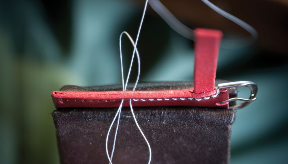 Then, there are Sabel’s favourite types of leathers: the English bridle and oak bark. The former has been used for more than a century in the equestrian trade, and the latter, believed to be the first tanning method, employs a slow process that can take up to 20 months and gives the leather a distinctive aroma. Even the techniques Sabel uses are reminiscent of a bygone era. Instead of machine stitching, she sews by hand using two needles and a single linen thread to create a double-handed saddle stitch that is stronger and doesn’t unravel if damaged.