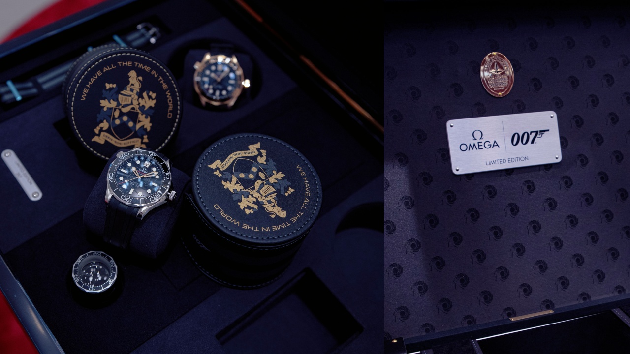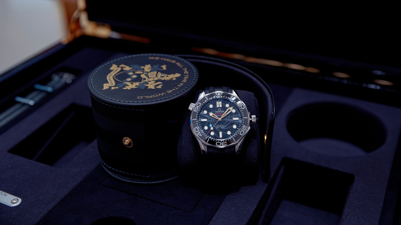 The set is presented in a super-spy worthy suitcase by British luxury luggage experts Globe-Trotter. Inside, one will also find extra accessories such as watch cases, a stainless-steel bracelet and a pair of NATO straps. There is a loupe as well, decorated to look like a Seamaster bezel—a nice touch with which to admire this highly collectible kit.