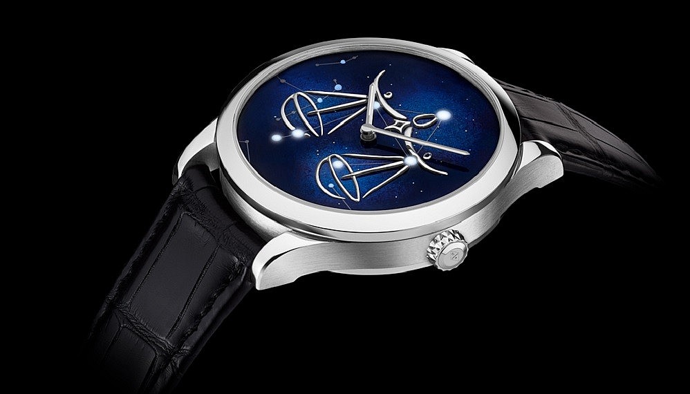 The beauty of the light-on-demand module is that it’s not battery operated and doesn’t eat up the watch’s power reserve. That means you can show it off as many times as you like, if you don’t mind being that person that strikes up the astrology conversation at a dinner party. (Or, if you’re clever, you might use it as a subtle way to alert your significant other that it’s time to leave while you pretend to play with the watch.) A pusher on the side of the white-gold case of each timepiece activates the lighting system, which you can feel spring into action on the wrist. The light that shows through the enamel beads — which mark the stars on each zodiac sign — shines for just three seconds at a time. The vibration of a ceramic strip is what lights up the four to six LEDs within.