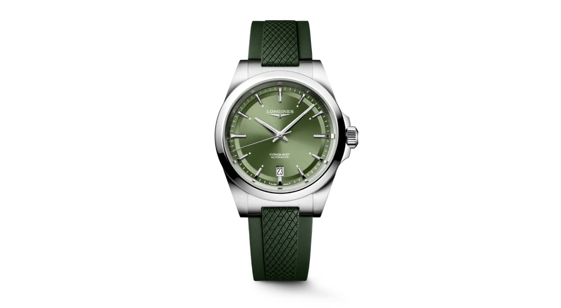 For those who prefer larger timepieces, the 38 mm and 41 mm versions feature new rubber straps in green, blue, or black, embellished with the Longines hourglass motif and fitted with micro-adjustable double-folding safety clasps. These models are matched with stainless-steel cases that house coloured sunray dials and applied silver indexes. The 41 mm model can also be customised with a steel bracelet and diamond indexes for a touch of sophistication. With sizes ranging from 30 mm to 41 mm, the Conquest offers unisex appeal, ensuring that everyone can find their ideal watch, regardless of wrist size or style preference.