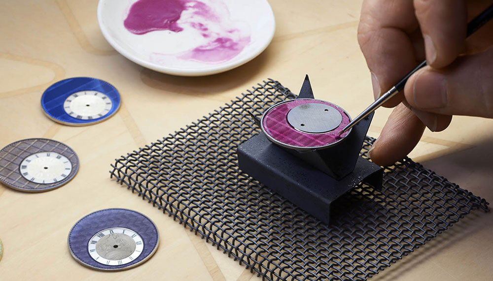 So the Prince of Wales check pattern shows up in Reference 1400U/000G-B215 as a raspberry-hued series of superimposed squares connected by vertical and horizontal stripes. The Herringbone (Reference 1400U/000R-B159) is a pleasing lavender, with contrasting zigzags conjuring sophistication. Windowpane (Reference 1400U/000R-B216) is a geometric pattern captured in warm grey enamel, while Pin Stripes (Reference 1400U/000R-B217) is a golden encapsulation of Savile Row style.