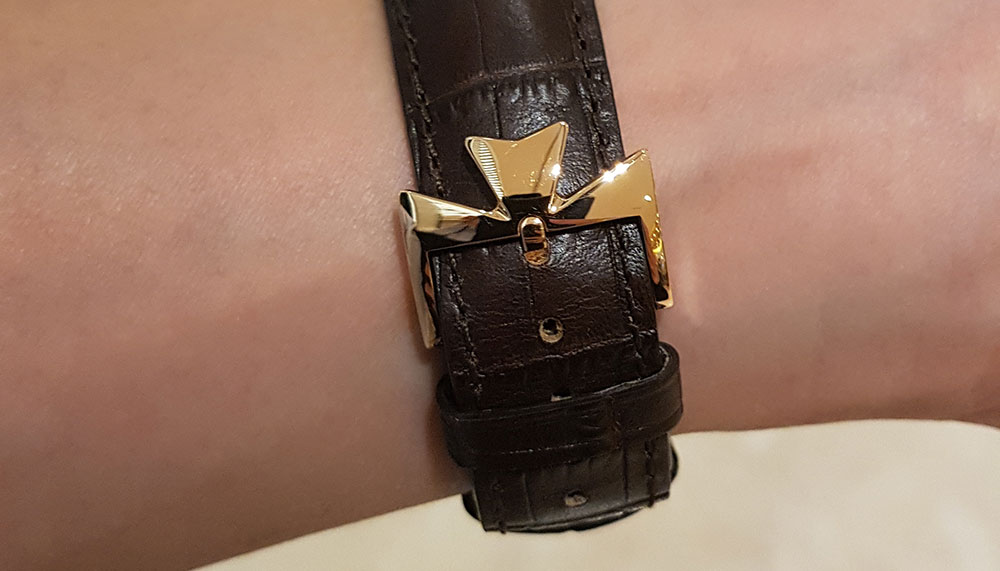 A leather strap is present on all Fiftysix models (brown for gold models; black for steel), with the Maltese Cross for a buckle. No deployment closures here, but whether that’s a good thing or not is entirely dependant on your point of view.