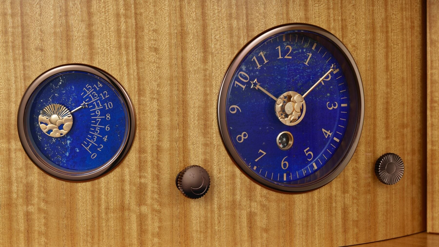 This year’s version is bright and colourful—the base is in light woods, the floor beneath the dome is a vivid blue lapis lazuli, and each of the celestial bodies are little objets d’art in their own right. Crafted out of varying stones, they are decorated with sculpted references to the mythological figures each planet is named for. The Sun is particularly resplendent, featuring spessartite garnets, yellow sapphires, and diamonds set on more than 500 gold stems; they quiver at the slightest vibration, adding to the sparkle. As before, the movement of the planets Mercury to Saturn are tracked in real time—and hence move very slowly, with Saturn taking 29.5 years to complete its orbit. There is also an on-demand animation module, which, on activation, finds a rose gold shooting star set with diamonds and rubies emerge from a hatch and is sent flying around the circumference; the planets dance out of orbit, accompanied by a melody that is chimed by a 15-bell mechanism in the base. The base also houses indicators for time and date—it functions as a perpetual calendar, as well.