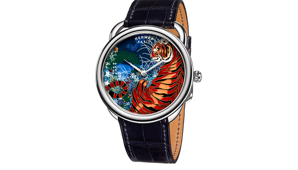 Porchet’s enamels can be easily identified as they all bear her initials. Obviously enamel dials made by her own hands are priced at a premium to those made by her apprentices. The unique Hermes Arceau Tyger Tyger, for instance, was priced at about RM390,000 as compared to the Slim d’Hermes Dans Un Jardin Anglais which was listed at RM250,000 and Slim d’Hermes Promenade De Longchamp at about RM270,400.