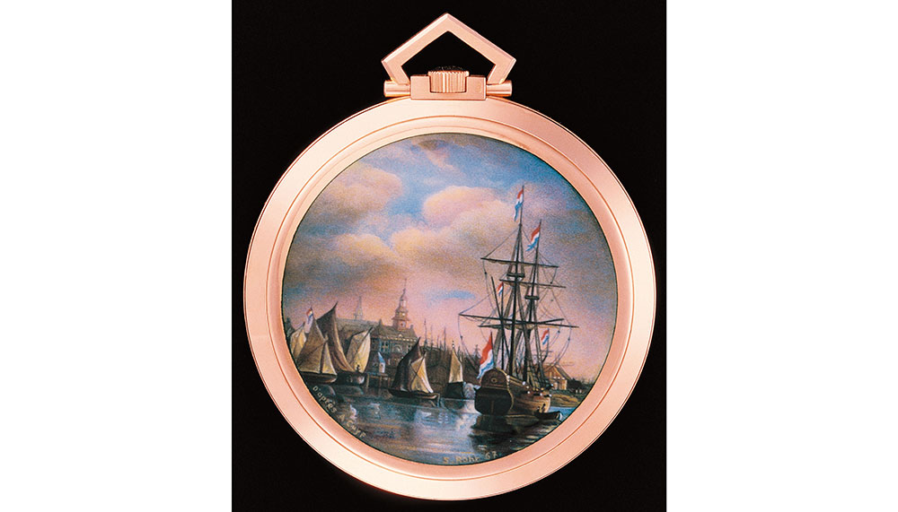 In 2005, Sotheby’s sold a gold open-faced pocket watch that has a caseback decorated with a Gustave Courbet painting depicting Chateau de Chillon, signed by Rohr and dated 1978. The estimate was €15,000 to €20,000 (RM71,400 to RM95,200), but the final price was €50,400 (RM239,800) including buyer’s premium. Rendered with striking detail, it is an outstanding showcase of Rohr’s speciality, the Geneva Technique, which is miniature painting with grand feu enamel.