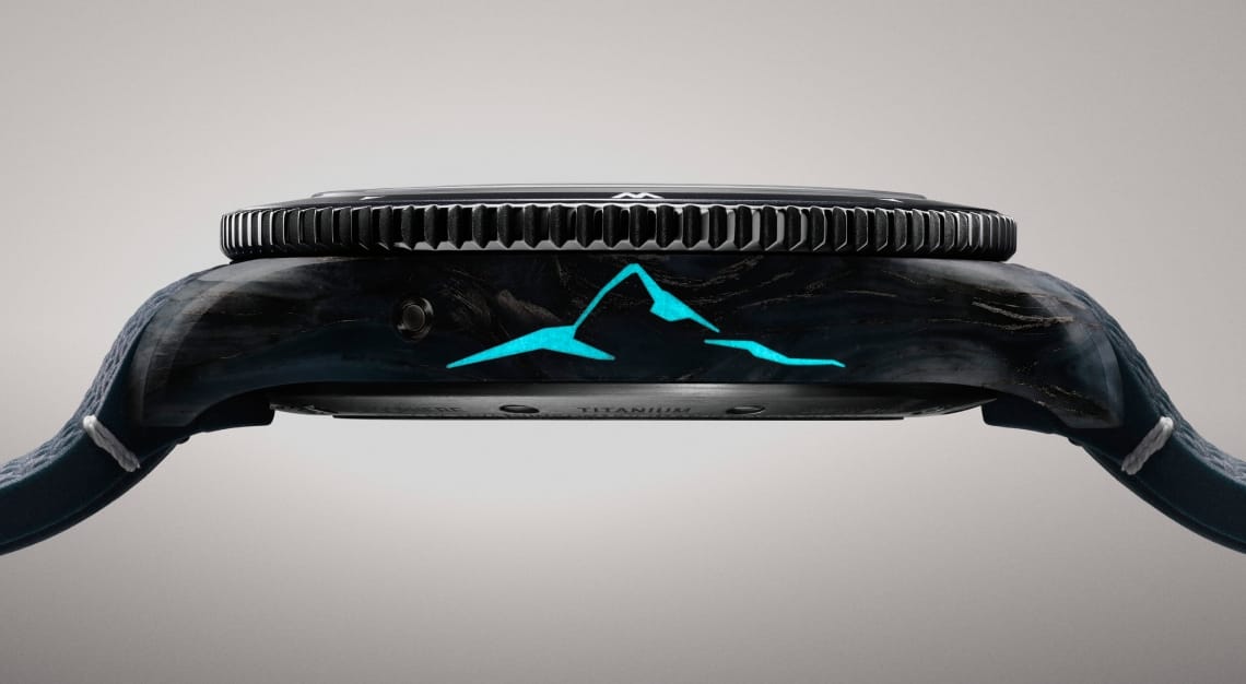 The new 1858 Geosphere 0 Oxygen Mount Vinson Limited Edition, which is limited to 986 pieces, adds another feather to its cap. In addition to the aforementioned features, the watch boasts a titanium case with a special composite middle component. Made of quartz fibres, aluminized basalt fibres, CaCO3, and light blue resin, the case middle’s texture evokes that of Mount Vinson’s landscape, which brand ambassador Reinhold Messner scaled in 1986. It was a climb that marked the completion of Messner’s Seven Summits Challenge, which saw him scaling mountain peaks on each of the seven continents. Also immortalised on the side of the case, the outline of Mount Vinson glows with a luminous blue hue in the dark, adding to the watch’s evocative allure.
