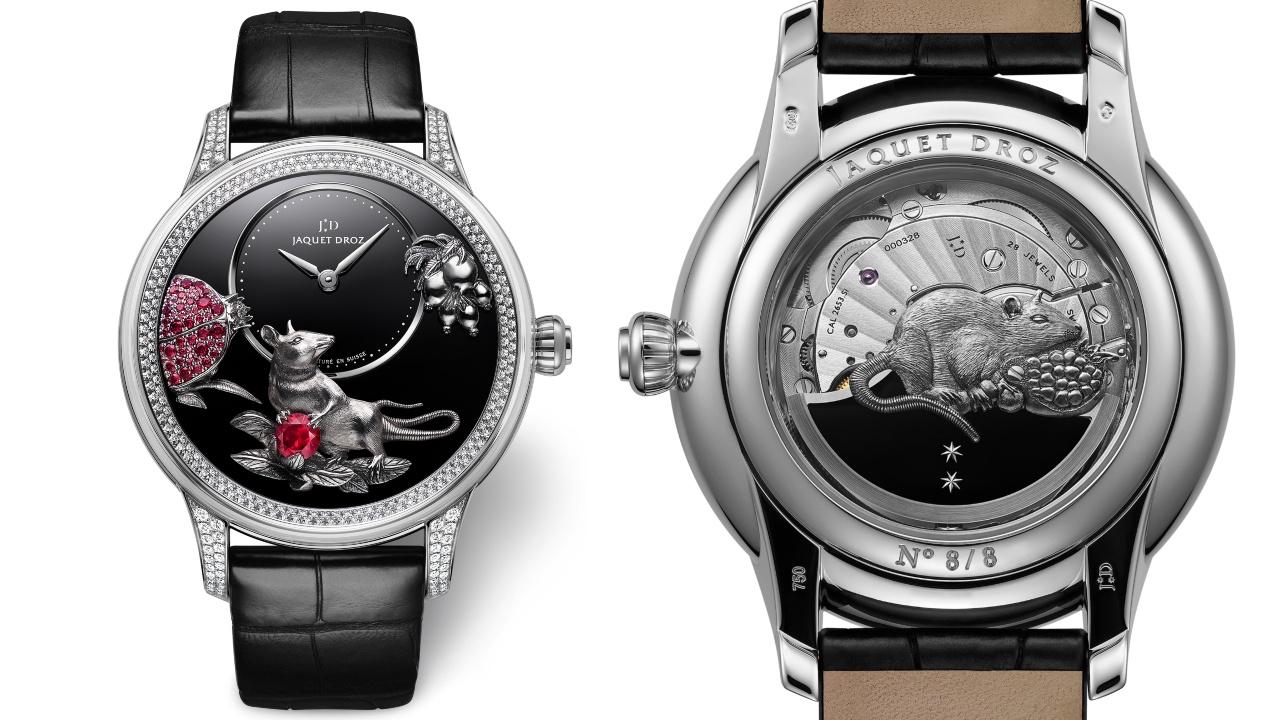 One of four Year of the Rat-themed limited editions from Jaquet Droz, the Petite Heure Minute Relief Rat in white gold case (RM299,500) sports a deeply black onyx dial with hand-engraved and hand-painted white gold appliques. Pomegranates, an ancient symbol of life and fertility, are depicted with 57 rubies; one particularly large gem represents a seed clutched in the rat’s paws. The 41mm case also sparkles with 272 diamonds, and the self-winding movement within sports a silicon balance spring and pallet horns, and is double-barrelled for a total of 68 hours of power.