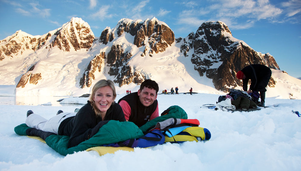 The crew ferries passengers loaded up with special sleeping bags and bed rolls across to Useful Island, in the Gerlache Strait. With our camp being a sleeping bag and sky without nothing in between, our little group work up a sweat digging a trench in the wind-hardened ice, piling the snow in a foot-high wall that will help protect us from the whipping polar gusts. Then we settle in for a night under the polar summer skies, all of us snug basking in the silence of Antarctica.