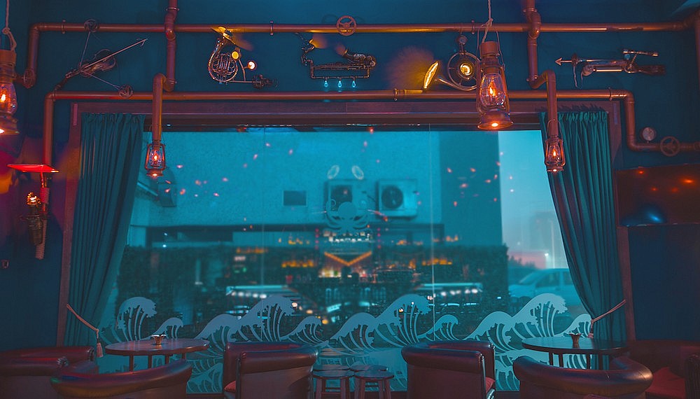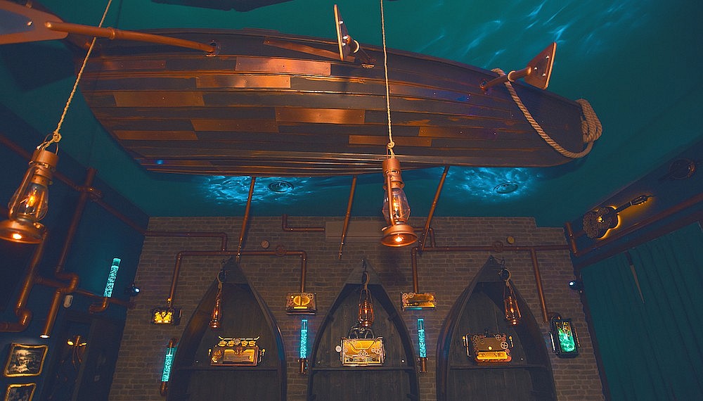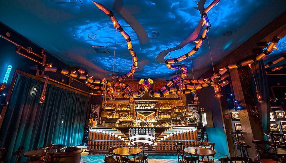 Officially, possibly to avoid copyright issues, the design is the Kraken. The mythical, tentacled monster forms the logo of the Abyss Pub, as well as dominating the ceiling as it stretches out its feelers from its perch above the bar. Made from copper and measuring nine metres each, cleverly hidden projectors throw dynamic projections onto the ceiling, making it feel constantly in motion, supporting the beast as it reaches for the hull of a wooden boat, built in a corner of the ceiling. The herringbone wooden parquet floor and deft Art Deco touches transport the scene back in time, including musical instruments mutated into steampunk lighting fixtures. Unique and unusual, the Abyss Pub is an awesome find in an most unexpected place, managing to merge liquid pleasures with an underworld fantasy. If you’re ready, then let’s dive deep.
