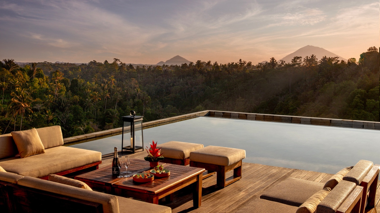 From the heights, the sweeping landscape is visually hypnotic. “One of the most magical moments at our resort is at sunrise, when you can witness the sky’s vibrant colours and enjoy an unobstructed, magnificent view of the famous three mountains—Mount Agung, Mount Abang and Mount Batur—all majestically aligned as you stand on our lobby deck,” says Christian Gerart, general manager of Anantara Ubud Bali Resort. Among the many open-air viewpoints, the heated infinity pool adjacent to the Sulang al fresco bar is arguably the crown jewel, offering staggering views of the misty valley below.