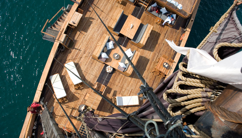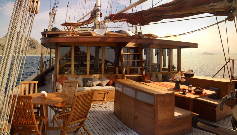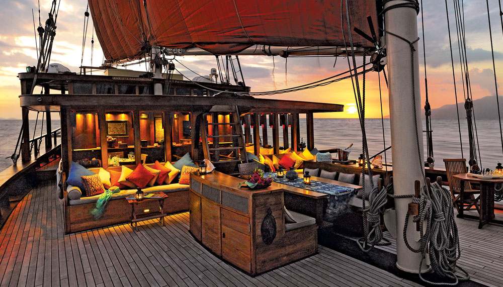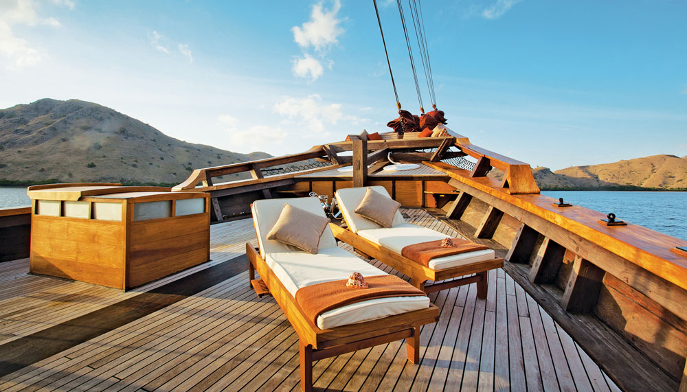 “Welcome to the Ring of Fire!” Seery says, as if reading my mind. “I told you there were a lot more exciting things than dragons waiting for you here.” Indeed, a sail through Indonesia with Silolona Sojourns need never be short on thrills. The company’s two yachts—both modern interpretations of the traditional phinisi sailing boats once used by spice traders in the region—are available for custom charters throughout this country of more than 17,000 islands. The voyages can be as leisurely or as adventurous as one desires, though the bounty of pursuits—kayaking through aquatic jungles, scuba diving along coral reefs alive with seahorses and cuttlefish, island-hopping to visit pristine beaches and traditional villages— tempts most passengers toward the latter.