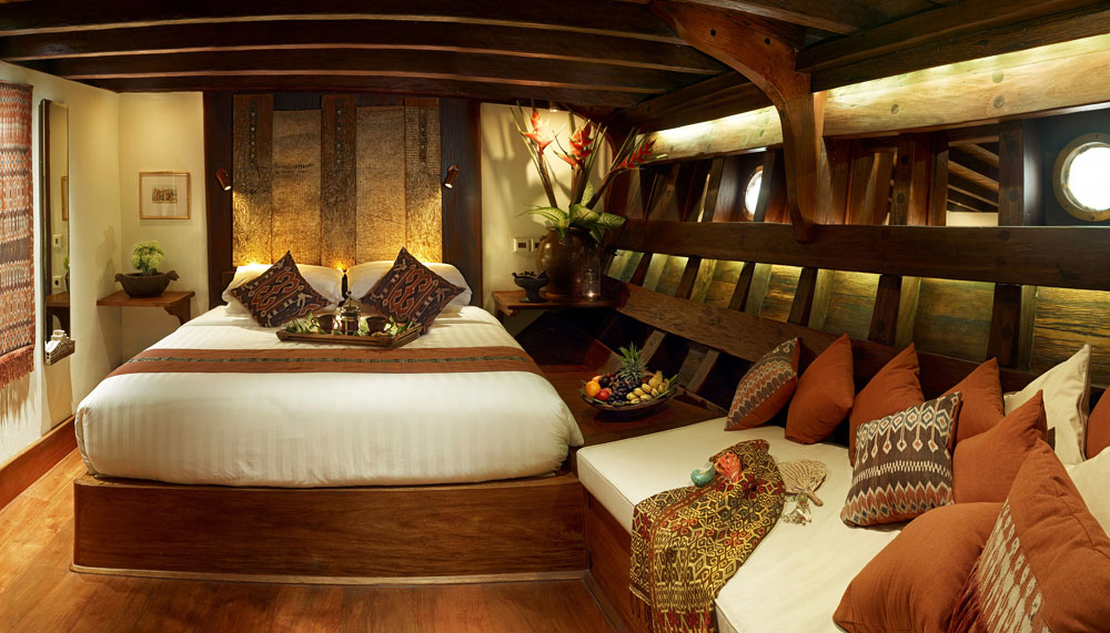Following our narrow escape, Seery and I settle in for a long calm after the storm: a 13-hour sail to the island of Lembata. As I scrub the volcanic ash off my arms and face in my stateroom, however, I sense no threat of cabin fever on Si Datu Bua. Seery enlisted a small army of Sulawesi boatbuilders to handcraft every inch of the vessel, from the ironwood paneling sourced from the jungles of Borneo to the bright-red sails. Launched in 2012, the ship includes three suites, a lounge, and a dining room, all of which are adorned with Indonesian textiles and artifacts that Seery – a former art historian for the Smithsonian – has collected around the country over the last 30 years.