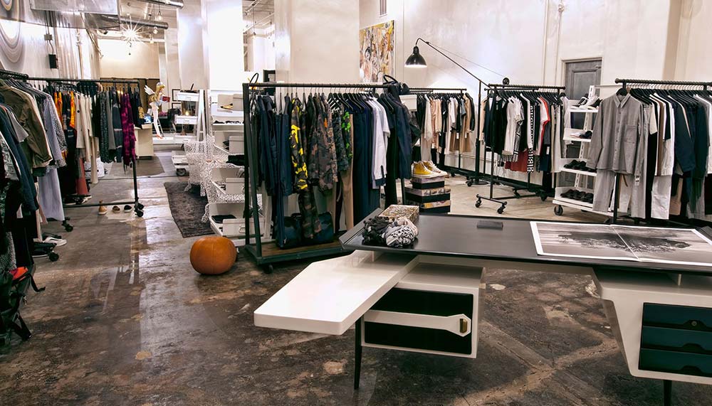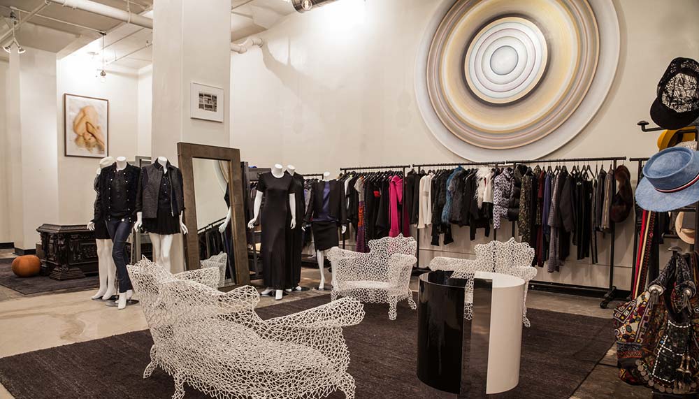 At the ultra-high-end Just One Eye, which occupies Howard Hawks’ old art deco studio off the beaten track in Hollywood, owner Paola Russo shows her not-insignificant art collection (major works include life-sized sculptures by the manga-inspired Takashi Murakami) alongside labels such as Alexandre Vauthier and the hard-to-find Beau Souci.