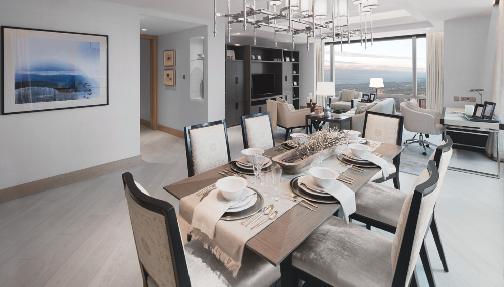 The hotel resides in a 62-storey tower, and is sandwiched between the residences and private apartments. In addition to 576 rooms, it features meetings facilities, a huge sports compound, restaurants and bars, and a full retail section.