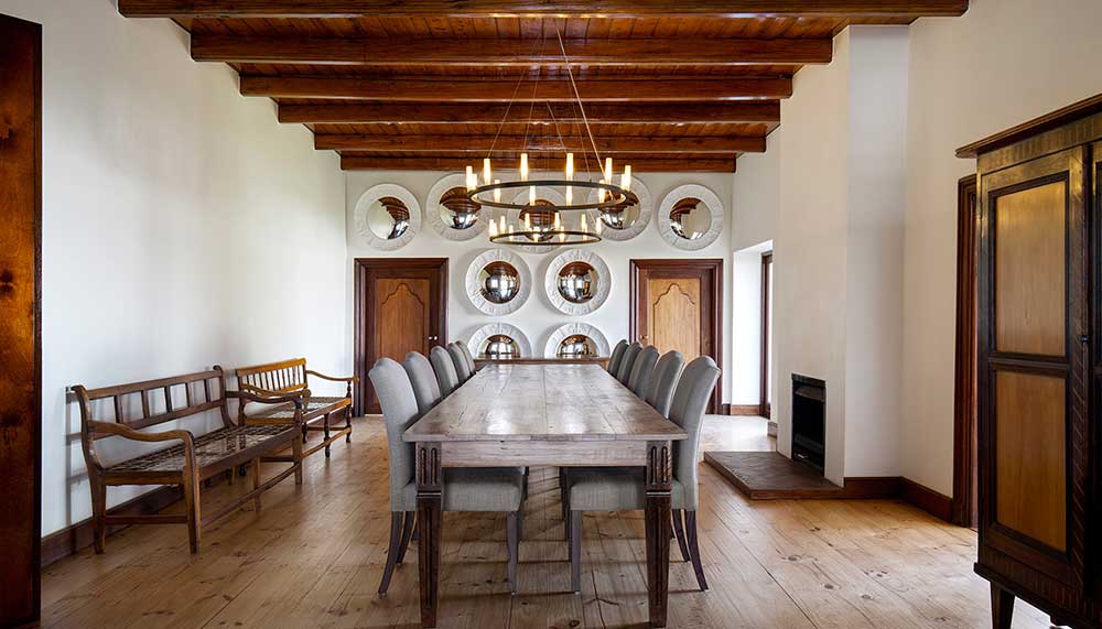 Standing out in a beautifully sharp juxtaposition is the property’s newly built chapel, ideal for weddings or peaceful reflection. Architect Coetzee Steyn from London’s Steyn Studio designed an undulating avant-garde silhouette that is meant to reimagine the curves of South Africa’s traditional Dutch “holbol” gables. A single walkway draws the eye past the chapel’s reflecting pools – which it effortlessly seems to float above – and through its glass walls and utilitarian interior to the mountainous views in the back. Guests of the farm can walk the chapel’s lush gardens, explore the property’s historic Cape Dutch manor house that dates to 1790 (Bosjes means “small bushes” in Dutch), or hike the nearby mountains to try and spot wild zebras, ostriches, and springboks.