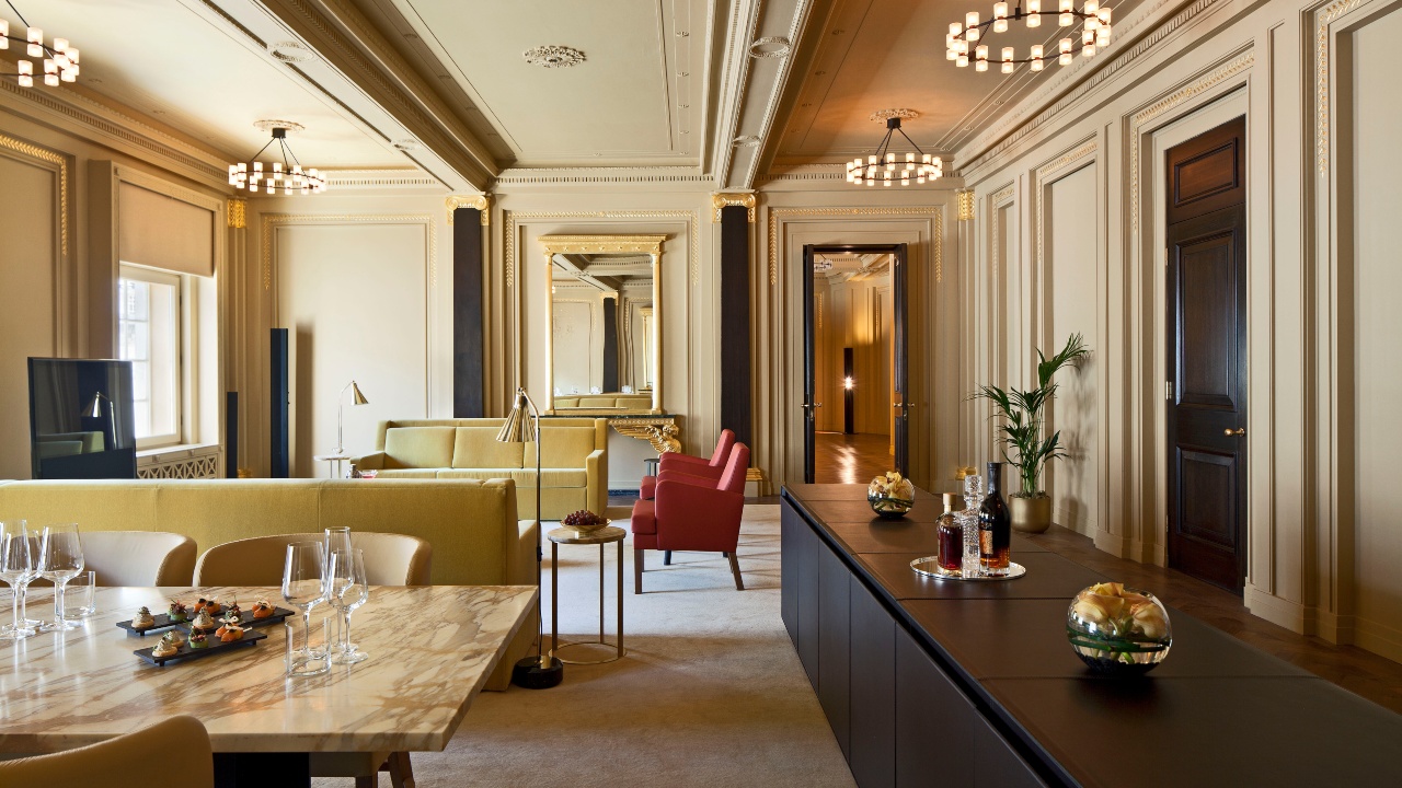 Among the hotel’s 160 guestrooms are seven signature suites with its three-bedroom Dome Penthouse commanding iconic views of the London skyline. Inside, the work of Sir David Chipperfield is showcased across over 3,000 square feet of luxury. Thus London, when lensed from inside of the hotel, becomes decidedly more breathtaking with the hubbub of the outdoors muted even as the breadth of its pedestrian life continually appear through the double volume windows (due to heritage considerations, the hotel has maintained its large windows).