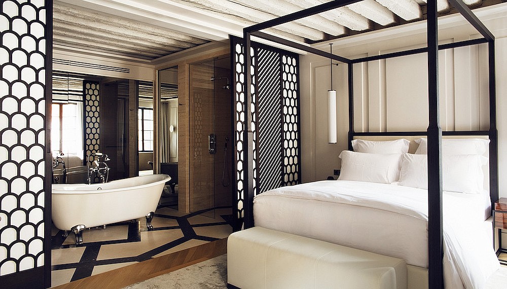 Housed within a 16th-century building originally part of the ornate Palazzo Grimani, the Palazzo has been reimagined after 70 years of disrepair by the interior-designer and husband-and-wife team of Anna Covre and Fredrick Tubau. The pair worked hard to preserve the building’s original character and architectural features, pairing restored beams, floor-to-ceiling windows, and façade with a modern Italian and French design ethos (Covre was raised in Venice, Tubau in Paris). Each of the resulting apartments has been carefully decorated with custom furniture designed by Covre and Tubau — all of which are available to be purchased through special order should guests fall in love with the space’s modern-meets-classic aesthetic.