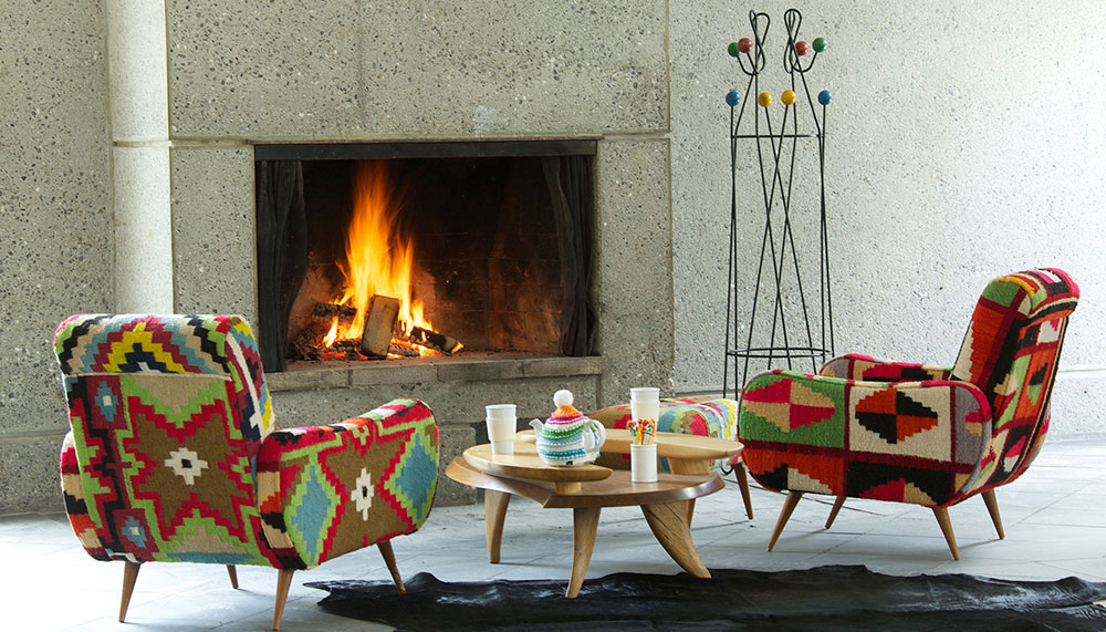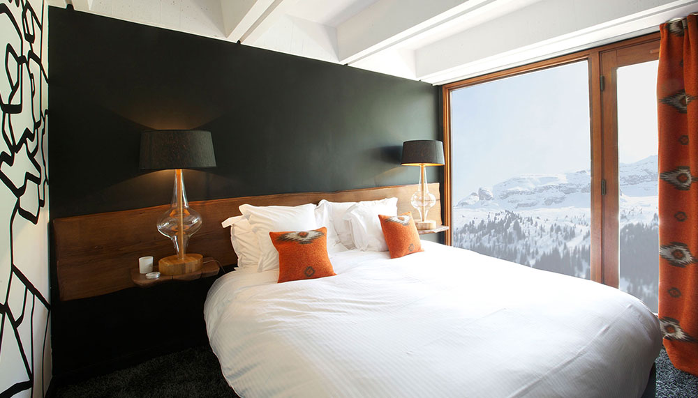 The lobby is dominated not by reception desks but by the in house ski rental shop (wonderfully friendly, but then I was their first customer). Beyond that is the long, open-plan lounge and restaurant, one side with floor-to-ceiling windows looking out on to forest and mountainside. The furniture is mid-century vintage; colourful woollen fabrics draw inspiration from Navajo designs (“we wanted to add some warmth to the Bauhaus,” says Jocelyne Sibuet). There are retro arcade games, exposed concrete pillars and walls, and some of Breuer’s classic Wassily chairs, the black leather straps re-covered in native American fabrics. Staff wear jeans and skinny white T-shirts saying “Skiers are better lovers” (which probably sounds better if English isn’t your first language).