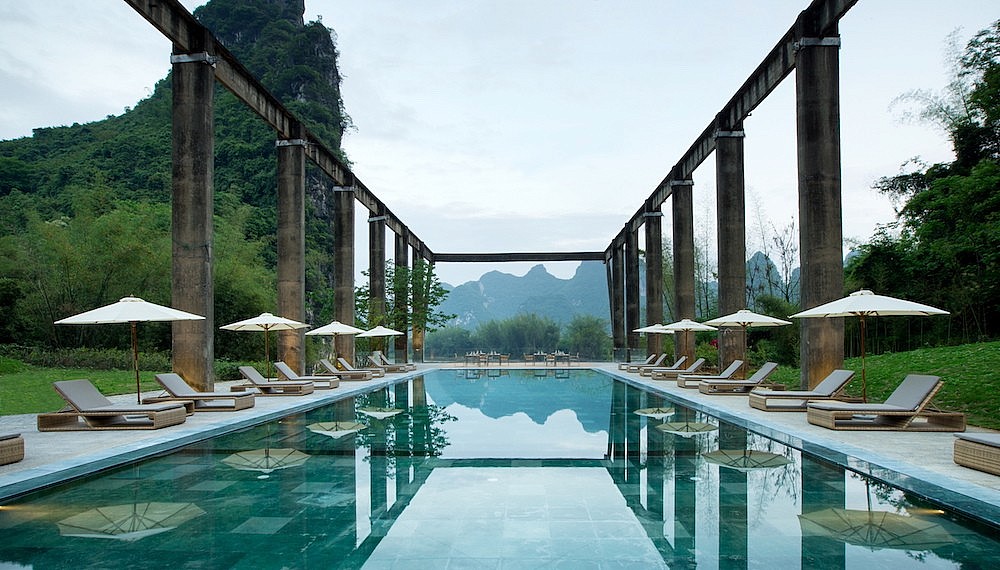 Life is sweet at the newly-opened Alila Yangshuo. Literally. Housed in a restored sugar mill, the latest Alila resort has retained as much of the 1960s factory architecture as possible, marrying it with modern amenities for a retro-throwback luxury experience. Designed by Dong Gong of Vector Architects and Ju Bin of Horizontal Space Design, the original elements of the Communist-era building take prominence. The sombre, brown-brick exterior has been retained, with rare touches of original adornments – like delightfully ornate air vents (some carved to resemble Chinese characters). In a more metamorphic touch, the original sugarcane dock jutting out the Yulong river is the the site of the swimming pool, flanked by the factory’s original steel pillars.