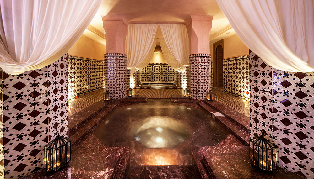Elsewhere in the riad, Moroccan culture is embraced. In the Pixel Room, a tableau of silk fabric tiles refashion the chaos of Jemaa el Fna is the cosiest of settings. In The Library, a vast collection of 1083 books celebrating French and Morrocan literature are on display, nodding to the French colonial ties in Morocco. Then there is the Hammam, which uses traditional mosaic patterned tiles in the zellige style cast in a repetitive geometric pattern that eases the consciousness into submitting to relaxation.
