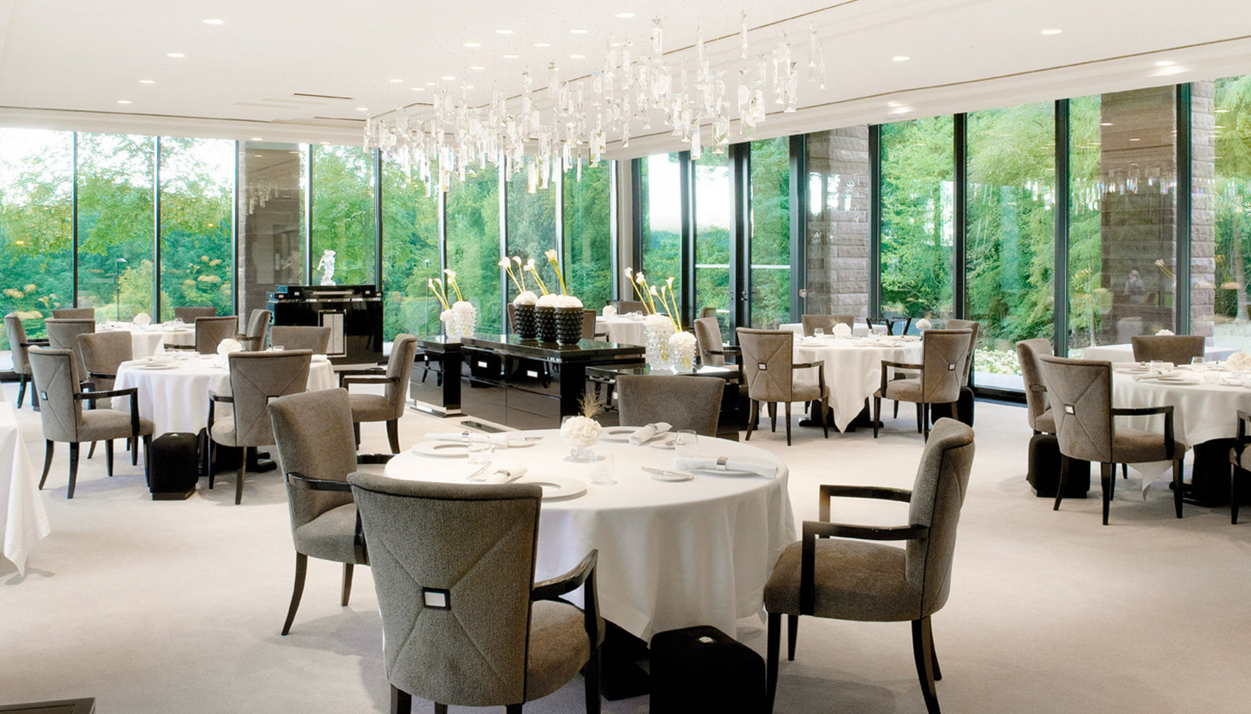 Unveiled last September, Villa René Lalique is decorated with historic family photos, Maison Lalique furnishings, and crystal accents. Adjacent to the home, a new glass pavilion designed by Mario Botta houses a 20,000-bottle wine room and a restaurant run by Jean-Georges Klein, longtime chef of the Michelin three-star L’Arnsbourg. Hanging in the dining room is a glittering crystal chandelier that Lalique designed in 1928 for the Orient Express.