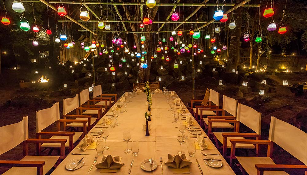 The Luxury Tented Camp experience commences with a morning tour of the Cambodian countryside in a Jeep accompanied by a driver and guide to discover local villages, hidden temples and archaeological wonders such as Prei Monti and Beng Mealea on the way to the camp site. Sustenance will be provided along the way with a picnic lunch in a unique spot: Poeung Komnou, surrounded by ancient Hindu carvings and lush greenery. Then on the road once again, to the glamping site, where a cooling cocktail sets the tone for one magical night. The ‘tents’ are each set up on 5x10m wooden platforms, with luxurious amenities that provide minimum fuss and maximum relaxation. With verandahs designed for basking in the outdoors and amenities from Cambodian botanicals brand Bodia Nature, tearing yourself away from the splendour of the unspoilt surroundings for dinner is tough. Heritage Restaurant at Heritage Suites Hotels, however, will tame temptation with a gourmet dinner served in the soft, flickering glow of hundreds of candles and tealights.
