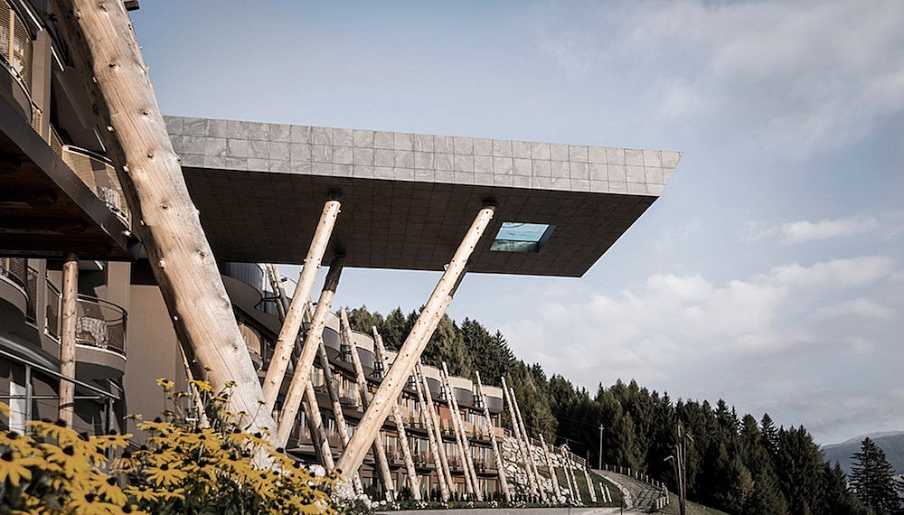 Supporting the cantilevered pool, which juts 17m from the façade of the hotel, are trunks of native larch trees stripped of bark. It somehow softens the blow of the angular pool, helping it to blend into the natural landscape. The trunks also make an appearance across the exterior of the curved hotel, unifying the aesthetic and also acting as room dividers and beams. The aim of the design, according to noa*, was to give the ‘swimmer the feeling of floating – weightlessly between heaven and earth.’ If that was the goal, then consider this a hat-trick.