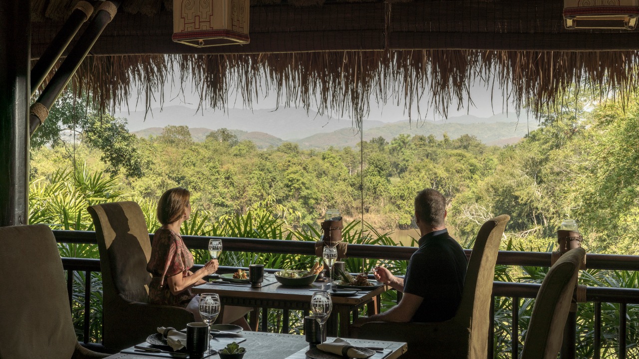 Bamboo flowers are not on the menu for humans, but the Four Seasons Tented Camp serves Thai classics such as Thai omelette with crab, steaming Laotian noodle soup simmered in a heart-warming basil broth, as well as the usual American-Euro spreads that includes commendable banana pancakes. For location dining, the bank around the Ruak River is lit in traditional northern Lanna style with seating for two on a raised dais, propped by ruby-coloured cushions. Here, a solo chef prepares local staples from a Kanthok menu with Four Seasons flair, featuring dishes like sai oua and kab moo (spice-rice Lanna sausage and crispy pork crackers); tom yam chicken soup; gaeng hang le (Thai pork curry); and larb moo muang (a chili-hot dish of minced pork with herbs grown at the camp’s garden).