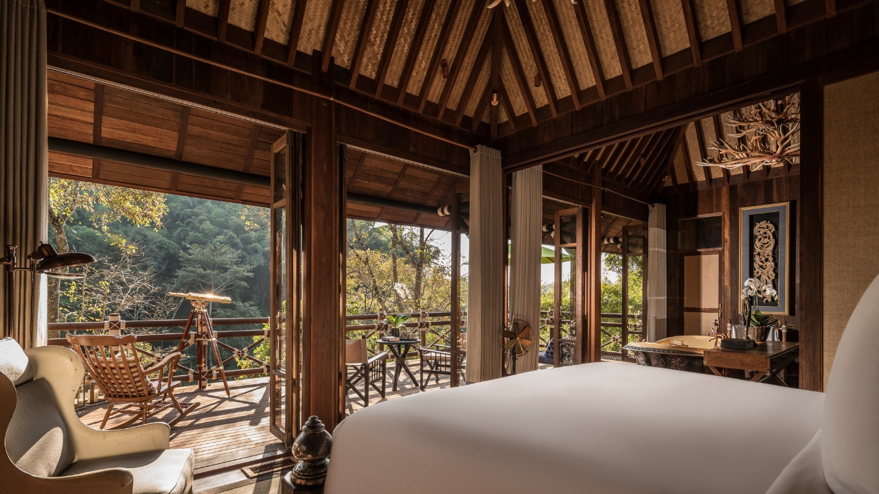 Surely though, the show’s location scouts wouldn’t pass over the dramatic cliffside setting of the Four Seasons Tented Camp in the Golden Triangle. The Bill Bensley-designed 15-tent property is shrouded by a sea of bamboo trees that often vanish with the cover of morning mists, along the Ruak River that runs off the mighty Mekong. It’s this unconventional Bensley project that allowed the designer to riff off, creating even wackier properties in the region in the decades since the camp’s opening.