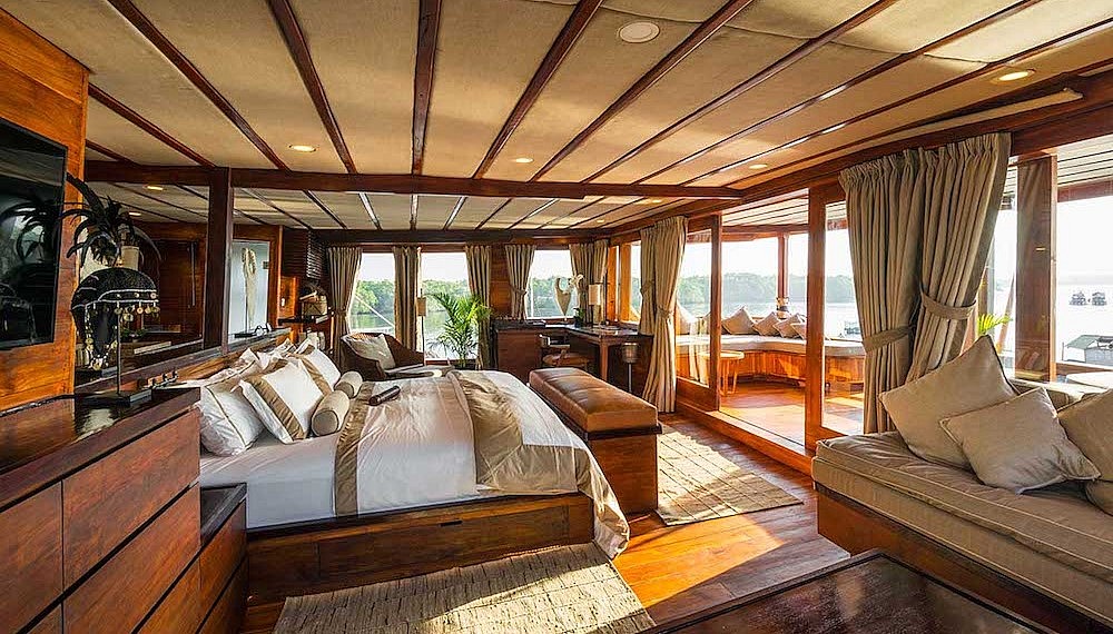 The new 180-foot/91-m long ship has been designed in the style of ancient Indonesian Phinisi vessels, featuring two masts and built entirely by hand out of ironwood and teak according to traditional methods. This, however, is where any hint at rustic stops, giving way to the kind of plush experience Atzaró’s Ibiza regulars have come to expect. Nine suites are spread across four decks, offering up plenty of privacy should you set sail with strangers (though we’d recommend chartering the ship out), and all feature palatial beds, vintage furnishings, and floor-to-ceiling windows that show off the aquamarine waters at every turn.
