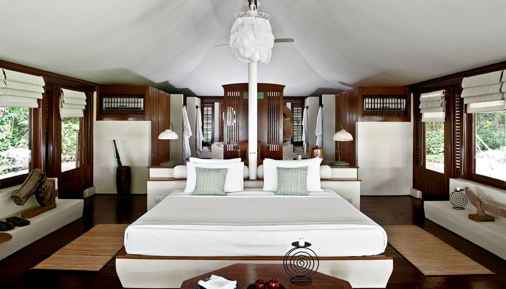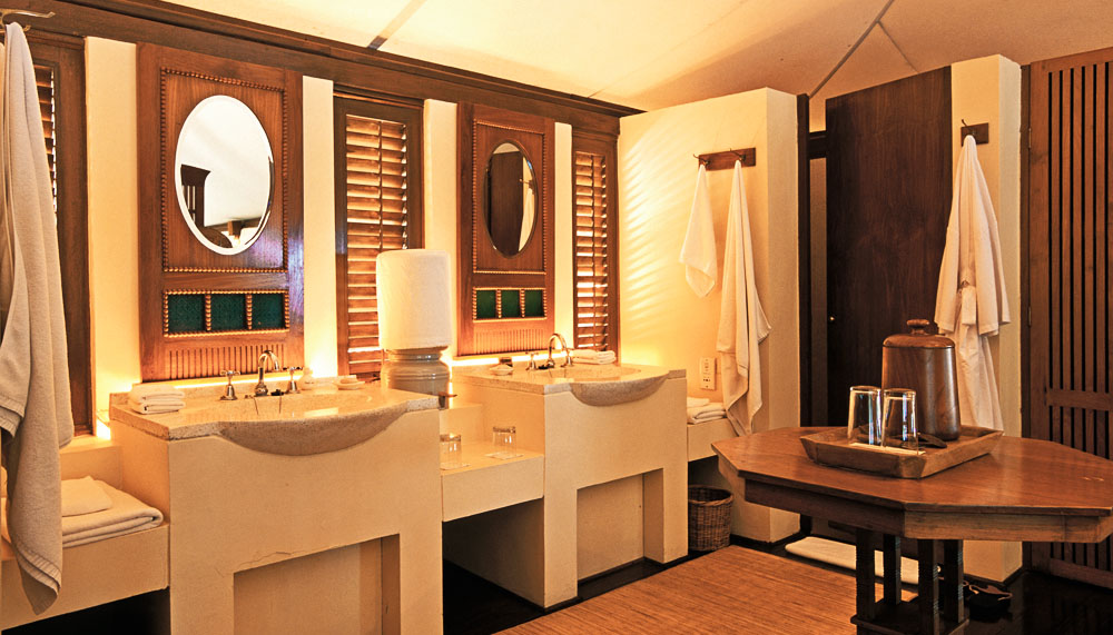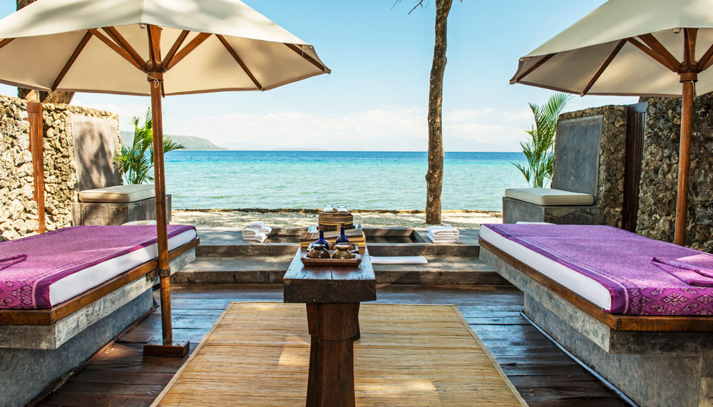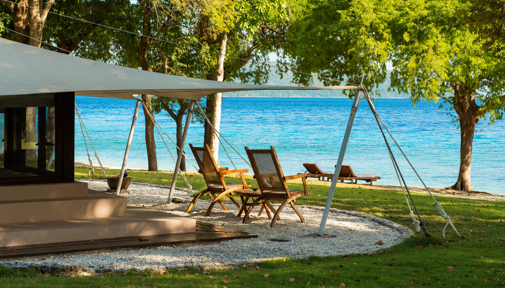 Each Aman resort is anchored by a unique concept; Amanwana’s is ‘camping by the beach.’ Twenty luxurious tented suites (ocean- or jungle-facing) form the resort proper, each containing a 58sqm living space under a soaring canvas ceiling, insulated with a waterproof exterior. Each is air-conditioned, centred around a king-sized bed and decorated with sterling examples of Indonesian art. A periphery of windows look out to a view of the sea or the leafy jungle, with each tent discretely positioned such that someone else’s is never in view.