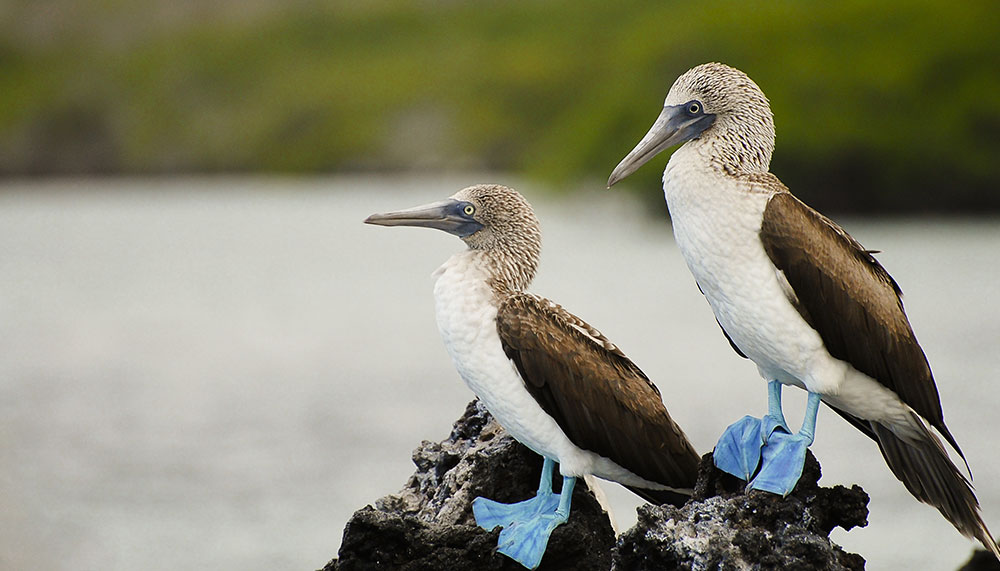 We have our first taste of Galapagos’ stunning wildlife on North Seymour Island, home to the largest population of blue-footed boobies in the archipelago. Boobies are the rock stars of the Galapagos; while they don’t have the reptilian thrill of the iguanas or the playfulness of the sea lions, their eye-catching pastel blue feet make them a firm favourite with camera-toting travellers, especially during breeding season when they perform comical mating dances which resemble a couple of plodding bobbies. They’re joined by frigate birds in their amorous inclinations; North Seymour is also home to one of the largest populations of these dynamic, jet-black sea birds. During mating season, males puff out distinctive red gular pouches on their chests in an attempt to get a little love.