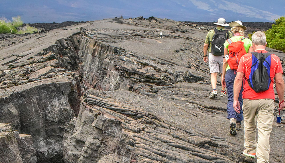 With a towering shield volcano at its centre, its flanks covered in powdered ash, Fernandina captures the essence of Galapagos perfectly; seal lion pups frolic in the shallows, one brave enough to waddle up for a sniff of my sneaker before bounding back to the water with a joyous bark. From a rocky outcrop we spy turtles grazing in a turquoise lagoon wreathed by lava banks, while endemic and endangered flightless cormorants, more comfortable diving the ocean depths than soaring the skies, watch us with brilliant azure eyes. Galapagos hawks circle on the thermals above as we make our way to a vast and desolate lava field that would cover an island the size of Hong Kong.