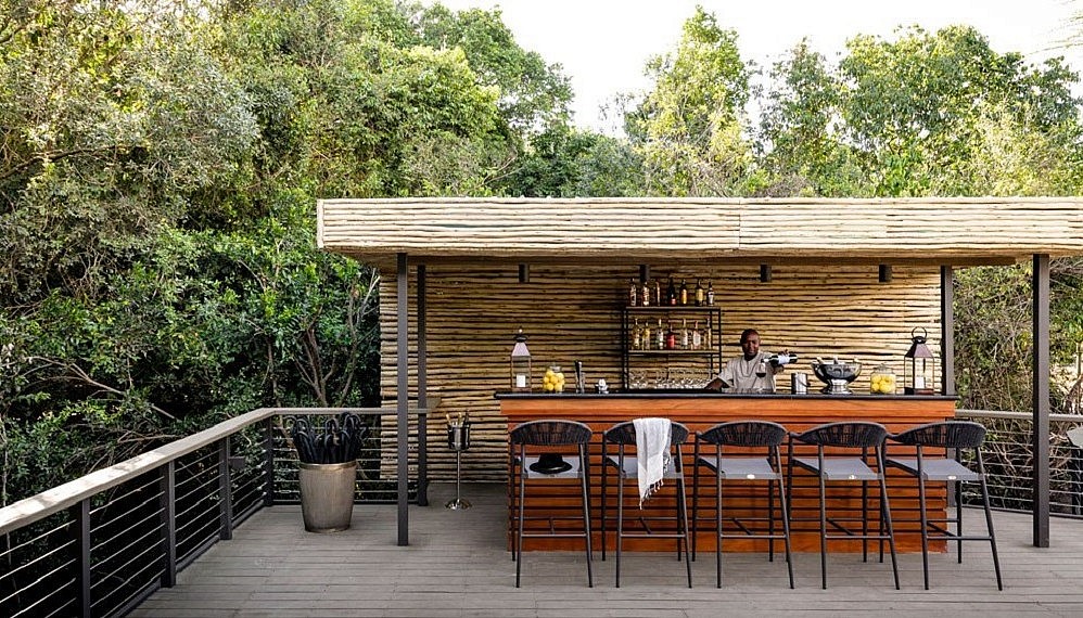Olonana’s main building — resembling a traditional Maasai home from the outside — is decorated with handcrafted spears, patterned prints, and Edison-bulb pendant lights, mixing African elements (many of which were custom crafted by local Maasai women) with contemporary details. Doubling as a dining venue and recreation room, the space is outfitted with a bar, fire pit, and library, as well as balconies that hang over the rushing waters below.