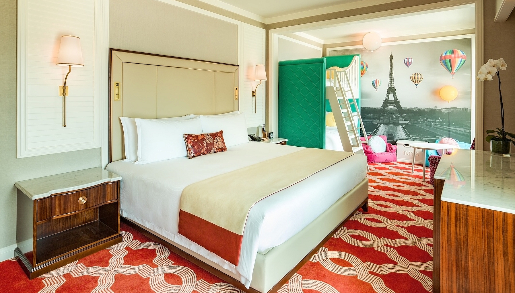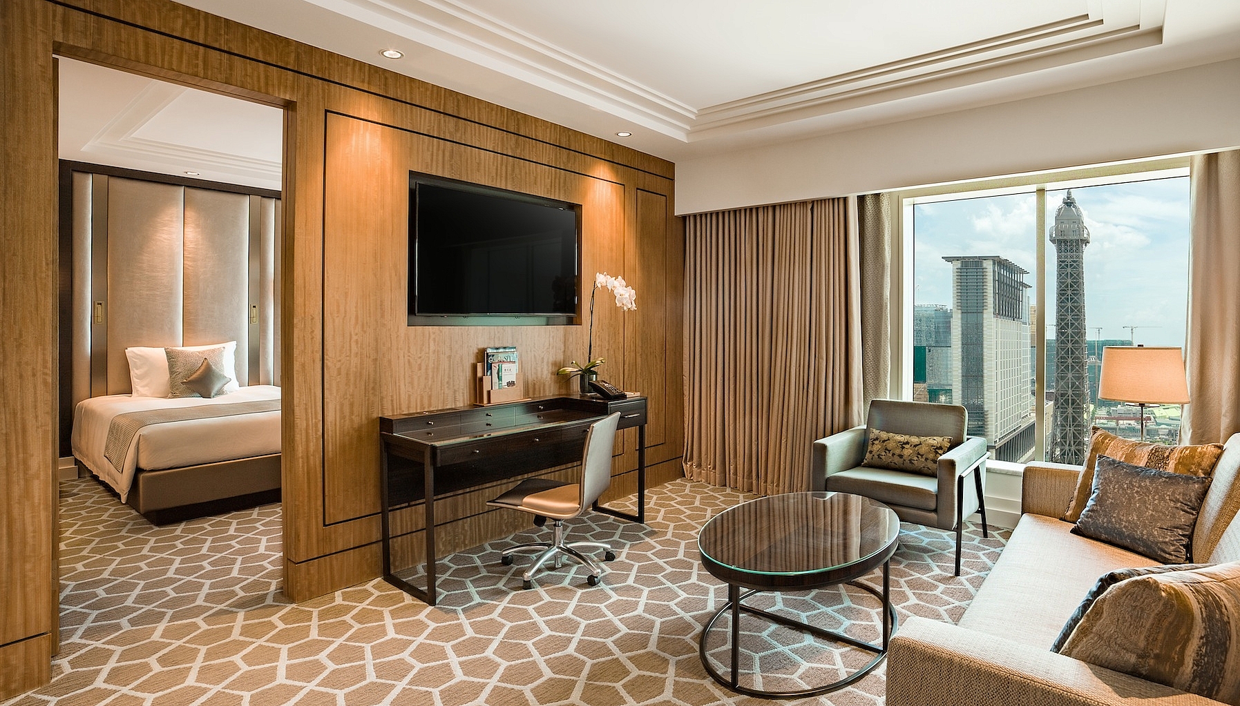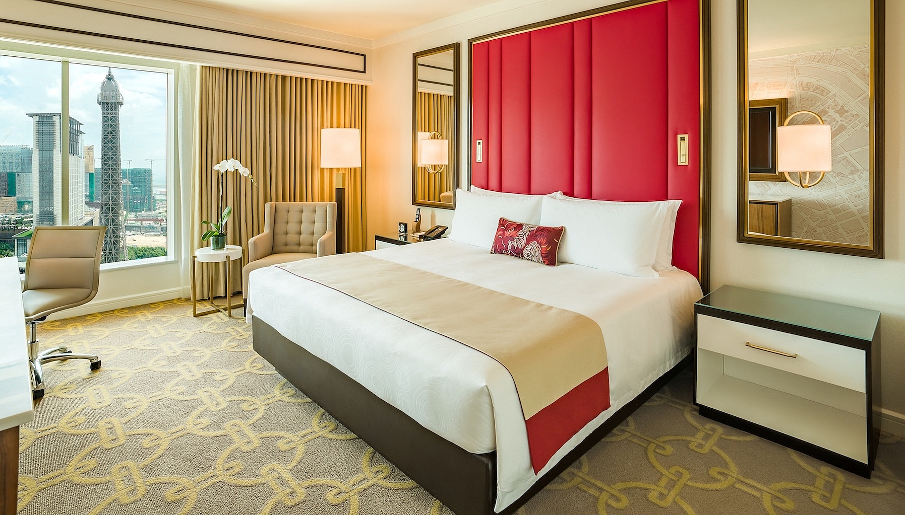 At The Parisian Macao, approximately 3,000 guest rooms and suites – including the sumptuous Versailles suite – offer plenty of living space. Inside these well-appointed accommodations, the Parisian touch is conferred through beautiful room illumination, Parisian signature bath products and, at the 72 sq m Lyon suites, separate living areas which command a view of the Eiffel Tower or manicured gardens.