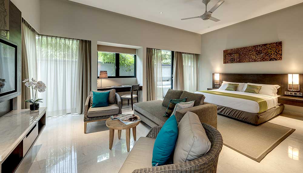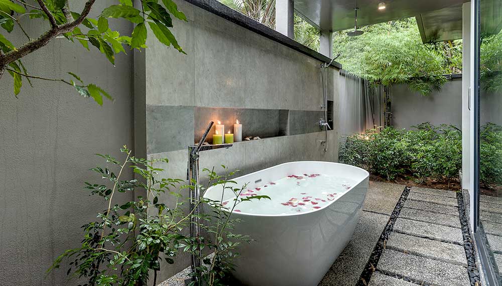 The rooms themselves are designed for a thorough pampering, as well as to encourage venturing outside. Wooden floors, spacious sliding doors, generous balconies/verandas and a cool, grey colour scheme allow the natural greenery to command the eye’s attention, an invitation to bask outside in nature. The Vana villas take this a step further, placing the shower and an oh-so-inviting bathtub outside, shielded by fronds of landscaped plants. The design of the entire resort is a lesson in clever tropical architecture. The villas themselves mainly face east, allowing the morning sun to start the day and shielding the scorch of midday. The architectural style is contemporary, focusing on right angles and plenty of open spaces to allow breeze to flow around the land’s contours, walls and slopes in a form of natural ventilation. Geoffrey Bawa would be proud.