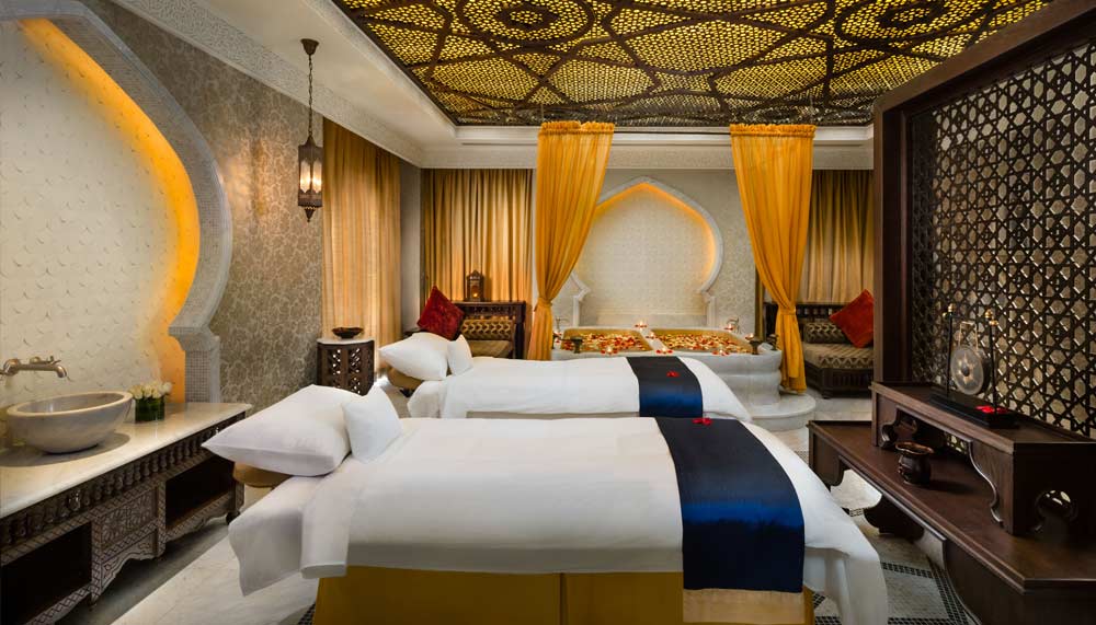 As with everything luxurious in the UAE, space is far from a concern. The spa is spread over 1,500sqm across two levels, and features a traditional Moroccan Hamman, two Jacuzzis and steam rooms, a heated marble cave and an ice cave. Here, you’ll find treatments using 24k gold sheets, and if there’s not enough, you can always opt for massages that use 24k gold, diamond or caviar oil.