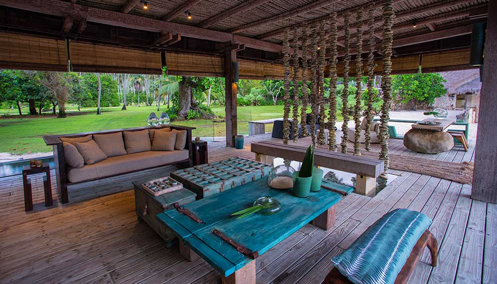 The Piazza, with a wide deck, open lounge and bar is a natural focal point of the island. Nadine pointed out the local materials reaped from the rehabilitation process in its construction such as inverted Takamaka trees converted for use as pillars, seashell curtains and log spouts. Adjacent to the deck is the library and a 4000-strong wine cellar. Built of coral blocks, the Library is undoubtedly one of the most spectacular examples of architecture on the Island and existed when construction of the lodge began.