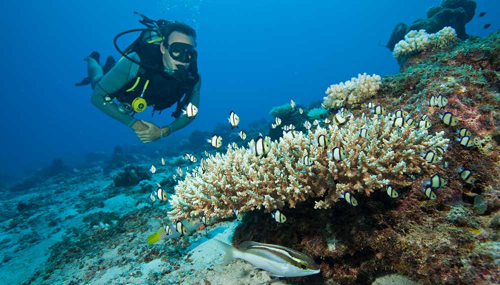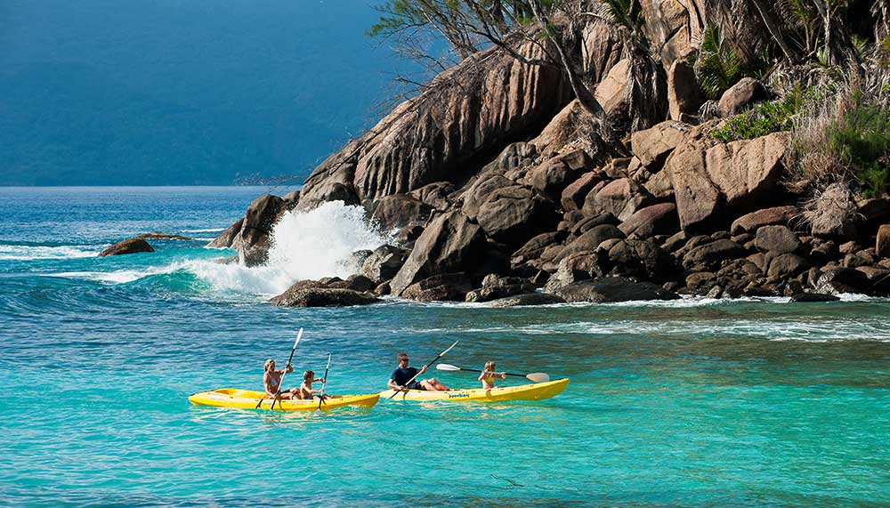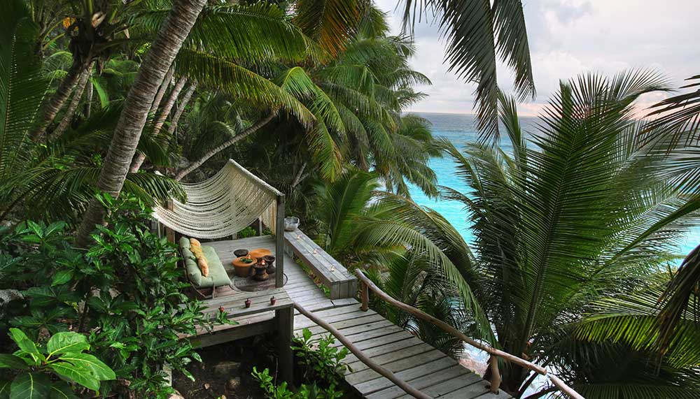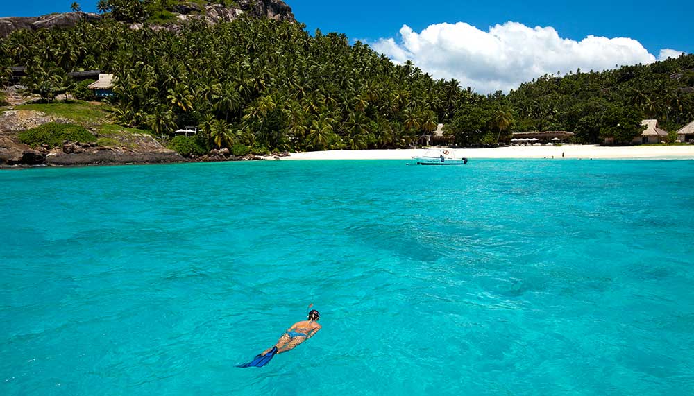 The island with no more that 11 guest villas is cosseted by palm-fringed sugar-white beaches and filigree reefs teeming with technicolour marine life. Three granite outcrops rise majestically from the kaleidoscope of jewel-toned waters, inviting sunrise hikes for glorious views.
