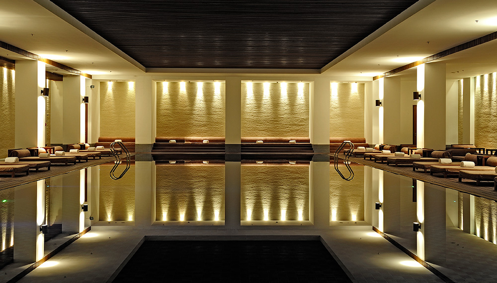 Beneath the lobby is the one overt sign that this part of the resort is modern. For tucked away beyond ground level sight is a unique 5,000 square metre, double-level underground recreational facility. Here, concessions to history take a backseat to plush modernity that defines the extensive gym, two squash courts, a juice bar, a 25m indoor lap pool and a private cinema, all accentuated by moody lightning and pinpoint architectural precision to ensure the space flows together with the historical context above.