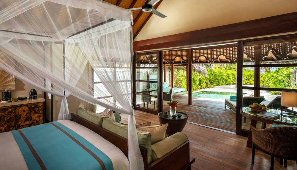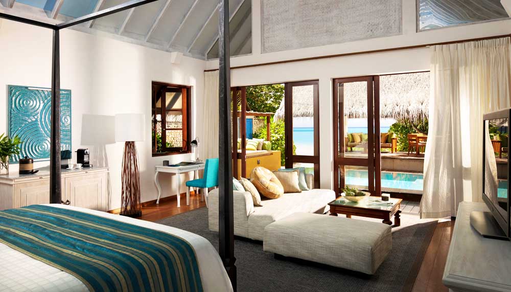 If Kuda Huraa is intimate, then Landaa Giraavaru is imposing. A 40 minute seaplane ride away from Kuda Huraa, Landaa Giraavaru can also be accessed with the Maldives Four Seasons Explorer, a luxury liveaboard that cruises between both resorts. Designed by Ismail Murad, a protégé of the late Geoffrey Bawa, Landaa Giraavaru feels supersized; a tropical national park that just happens to be fringed with bungalows. Where Kuda Huraa’s suites feel snug as a haven in dark wood, Landaa Giraavaru’s feel impressively Mediterranean, lofty ceilings in white and deft blue touches, mixed into an indigenous template.