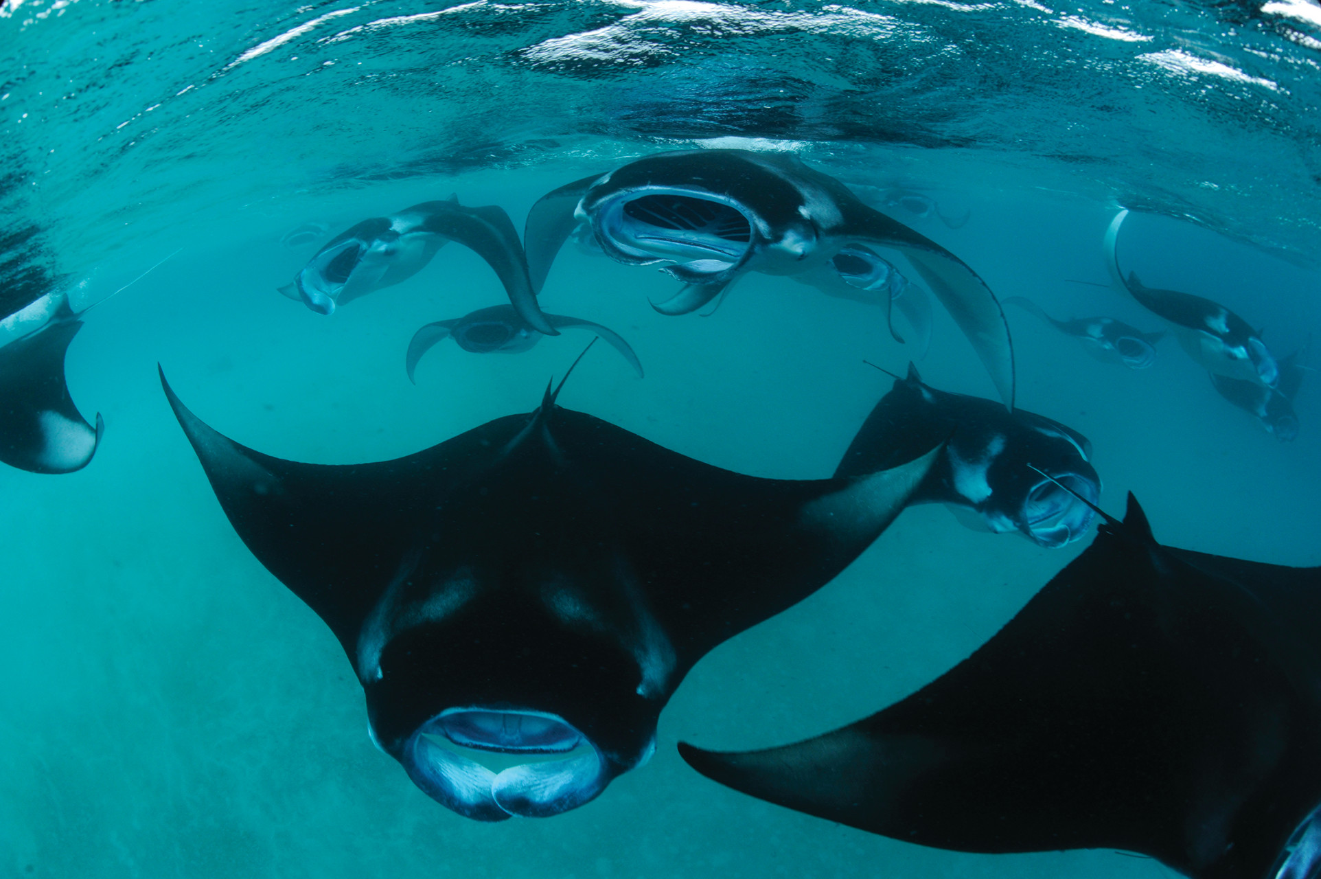 When we jumped into the waters, there were four mantas. This time they were not cleaning; they were feeding. No more slow, elegant sweeps. They were on a mission, darting and speeding, mouths open to funnel plankton-rich water in to be filtered. Diving isn’t allowed here, so we snorkel. So engrossed were the mantas in their meal that one barrelled straight toward me, and at the last second noticed an odd human in its way, ducked below and continued dining.