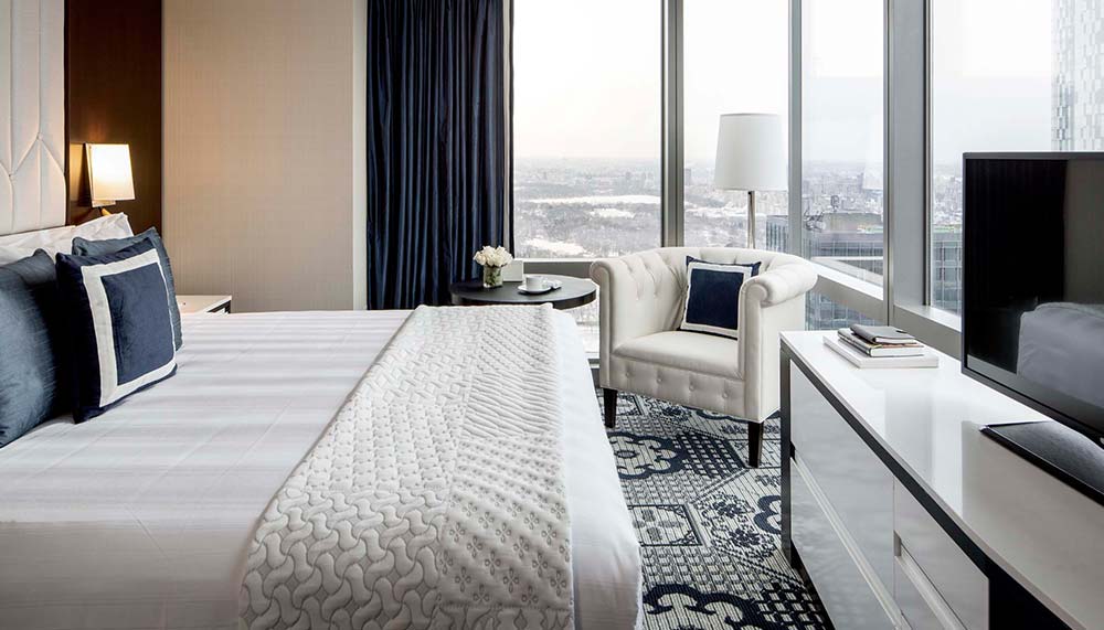 A custom-made headboard etched from embossed leather serves as the focal point of the single bedroom, while a large window overlooks the Museum of Modern Art’s Sculpture Garden. (Guests can opt for two- and three-bedroom configurations as well.) Amid the marble in the master bath, a glass mural created by Brooklyn artist Michael Davis frames a large soaking tub. Room functions ranging from temperature to lighting to television channels can be controlled with the Peninsula’s in-room tablet technology, which is available in 11 languages. Nightly rates start at US$19,000 (RM85,000).