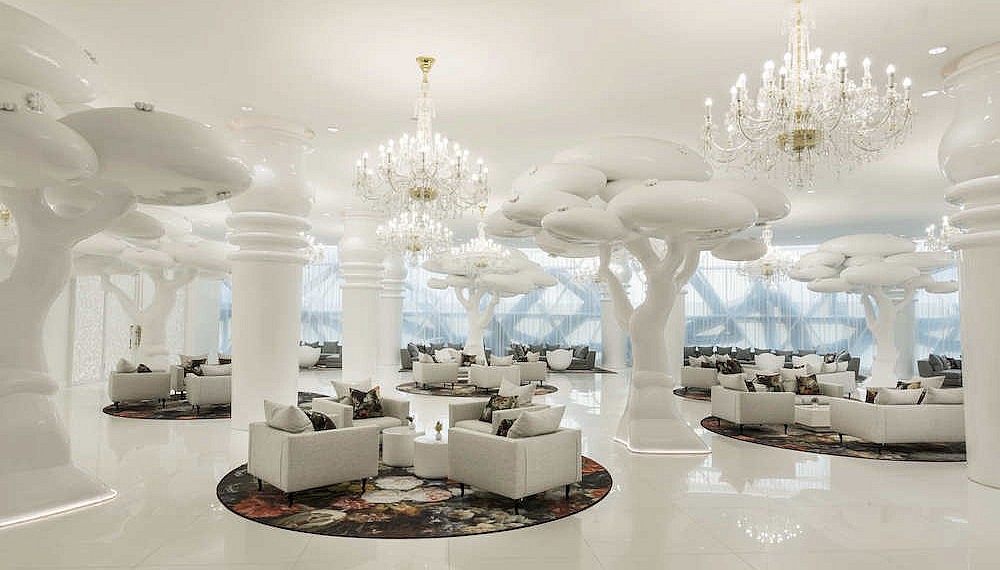 The hotel’s sculptural façade gives way to expansive common spaces and 270 rooms and suites, all brought to life by Dutch interior designer Marcel Wanders (who is fresh off a furniture collaboration with Louis Vuitton) and South West Architecture. The dreamlike design is a vibrant mashup of east and west: think Alice in Wonderland-esque sculptures and pop art prints alongside traditionally Middle Eastern motifs and icons.