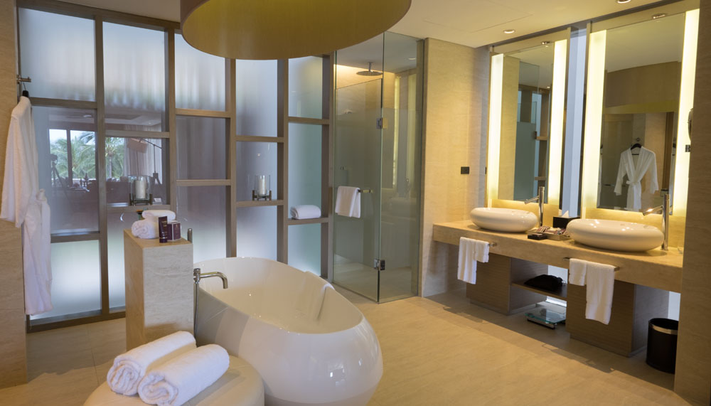 After a chilled and refreshing butterfly pea and ginger drink, guests complete check-in formalities at the Arrival Pavilion, a picturesque location with shimmering ponds that reflect the clouds and the ocean. Luxuriously appointed accommodations comprise 102 Ocean View Suites; 12 two-bedroom Ocean View Suites; 37 Ocean View Pool Villas; 23 Ultimate Pool Villas, and the Villa Kasara. Room amenities include high-definition LCD televisions with a wide range of satellite channels; complimentary Internet access, a powered safe; as well as tea and coffee making facilities.