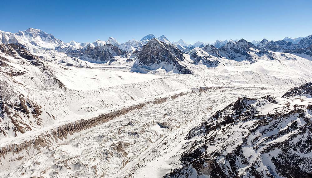 Next, it’s on to 5,303m and the legendary launching point for those attempting to climb Everest (king of the mountains at 8,848m) and Lhotse (fourth highest at 8,516m) – and that’s all before breakfast. The flight plan then veers toward Cho Oyu (sixth highest at 8,188m) with time spent in its lowlands at 4,907m. Downtime for the rest of the day is spent browsing around Bandipur and an overnight stay at Three Mountain Lodge.