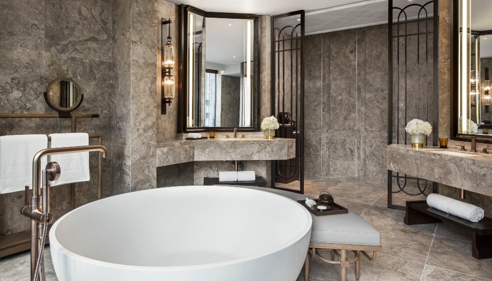 Even more importantly, it has the advantage of André Fu’s discerning eye, which means there isn’t a cushion or a cashmere throw out of place. The subtlest of details – bronze screens similar to the old window frames of colonial Hong Kong or carved indents copied from the columns of the old Wan Chai police station – are combined for maximum effect, as evidenced by the striking Great Room. Even the lights on the silver marble reception desks, reminiscent of 19th-century gas lamps, transform the hotel into a glamorous hybrid between a stately Hong Kong mansion and the grand classicism of the first St. Regis in Manhattan.